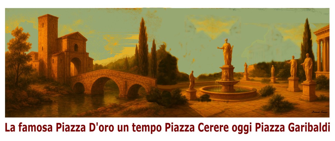 A Sora ,in questa Piazza denominata oggi Piazza Garibaldi , sicuramente esisteva per accogliere degnamente tutti coloro che giungevano nella Città di Sora provenienti dalla Capitale di Roma e da altre città vicine, una splendita piazza chiamata la " Piazza d'oro" adorna di numerose statue e fontane inaugurata durante l'impero di Cesare Marco Aurelio Severo Antonino Pio Augusto nel 211 dopo Cristo