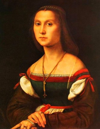 La donna in questa immagine indossa una Gamurra in panno oh detta anche camurra , mentre nel settentrione viene detta Socha, Zupa o Zipa .La donna del XV e XVI secolo prima di indossare la Gamurra sotto portava sempre una camicia di lino che al collo e a volte anche alle maniche vi erano dei ricami color nero come si vede in questo caso ,la camurra di panno verde in questo caso con delle strisce di colore rosso, la camicia chiaramente poteva essere di qualsiasi colore in questo caso era bianca poi sopra veniva messa questa Gamurra che non era altro una veste di panno corrente usata per uscire quasi sempre in questo caso di colore verde scuro ,infine si pùò notare il grembiule in basso che è fermato da un laccio rosso . Il grande Raffaello ha eseguito questo dipinto su una tavola delle dimensioni 64 x48 cm elaborato nel 1507
